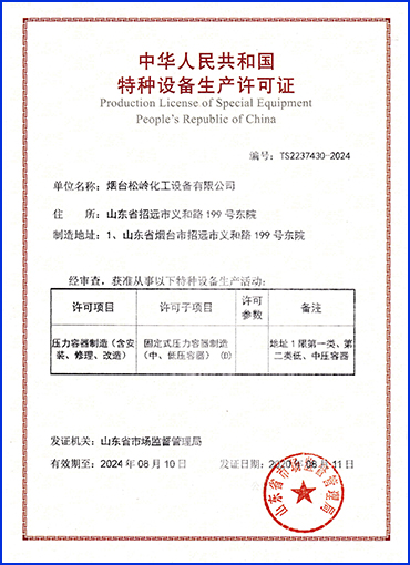 松嶺化工專(zhuān)注化工設(shè)備行業(yè)15年,集科研、開(kāi)發(fā)、設(shè)計(jì)、 生產(chǎn)于一體的高新技術(shù)企業(yè),還具備設(shè)計(jì)、制造D1、D2類(lèi)壓力容器資質(zhì)。